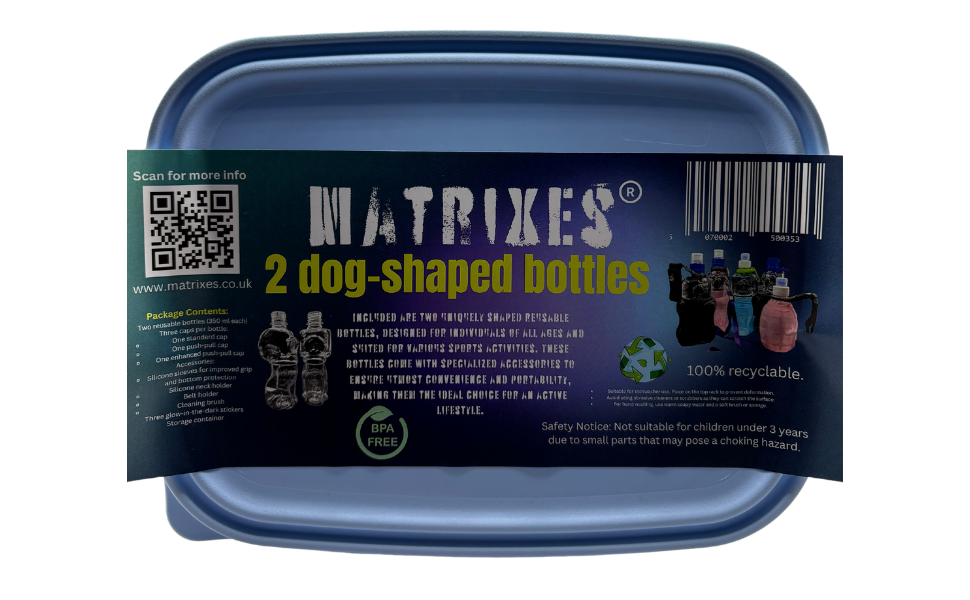 - Matrixes DogBox Set – the perfect companion for your active lifestyle! This unique package includes two reusable water bottles shaped like playful dogs, appealing to all ages. Each bottle has a 350ml capacity and is made from high-quality PET material, which is 100% recyclable and BPA-free.